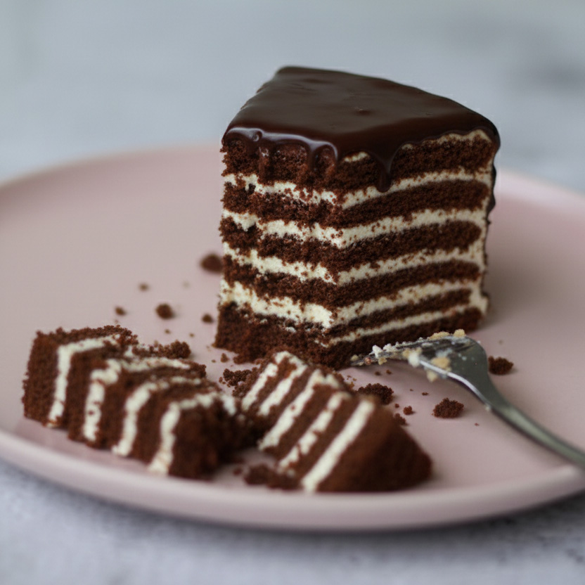 Rich chocolate honey cake layered with a smooth vanilla cream filling, offering depth without heaviness and a subtle, balanced tang.
